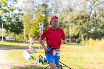 Da war es erst einmal vorbei mit dem „Einfachen“ und der Spaß konnte beginnen. Es war jedoch nur ein kurzes Intermezzo und so hatte mich der Radweg recht schnell wieder. Nach 11 Kilometern passierte ich den ersten von sechs Verpflegungspunkten. Danach wurde es richtig trailig, denn es ging auf schmalen Pfaden durch den tiefen dunklen Wald. Umgestürzte Bäume säumten den Weg und mussten überklettert werden oder es ging drunter durch. Das hat richtig Laune gemacht, nur die vielen engen Kurven waren etwas nervig. Deshalb hatte ich einen Läufer vor mir aus den Augen verloren und ich staunte nicht schlecht, als dieser mir bei KM 16 wieder entgegenkam, mit der Botschaft, wir hätten uns verlaufen. Obwohl ich mir relativ sicher war, auf der richtigen Strecke zu sein, folgte ich ihm erst einmal. Dann wurde es mir doch zu dumm und ich pfiff ihn zurück, um zu erklären, dass das doch die richtige Strecke war. So machten wir wieder kehrt und fortan lief ich vornweg und kurze Zeit später hatten wir anhand der Streckenmarkierung auch die Bestätigung, wieder richtig zu sein. Dieses kleine Malheur hatte mich vielleicht 2 Minuten gekostet, also nicht der Rede wert. Doch ich musste erst einmal wieder meinen Rhythmus finden. Nach 18 Kilometern erreichten wir noch zusammen den zweiten Verpflegungspunkt und hier erhielten wir die Info, Platz 8 und 9 zu sein.