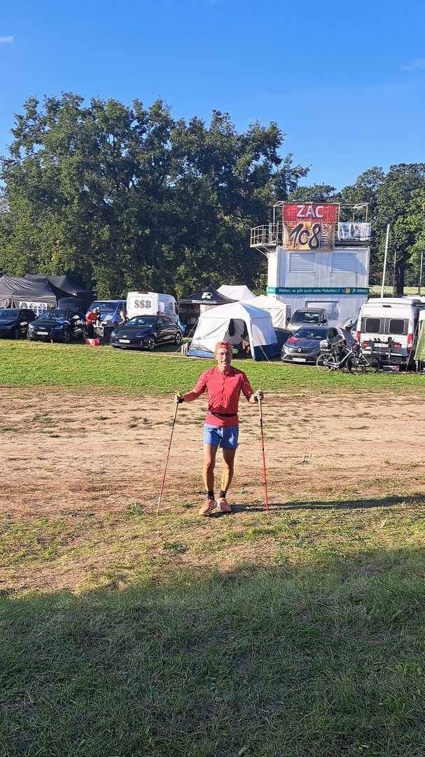 Wie ihr schon merkt, einen gewissen Erwartungsdruck hatte ich schon bei der Anreise und am Samstag war er noch um einiges größer, denn ich war angetreten, um das Goldenen Ei zu verteidigen. Jetzt kommt eigentlich die Stelle, an der ich erst einmal jammern müsste, aber ich mache es kurz, die ganze Vorbereitung hat praktisch nicht stattgefunden. Dieser verdammte Husarenritt beim Arnstädter Bach Ultra hatte mich praktisch zerstört und danach bin ich nicht wieder richtig fit geworden. Erst das Knie, im Urlaub kam noch eine Fußverletzung hinzu und dann Mission Titelverteidigung in Hänchen. Also Mission Impossible, denn es war auch richtig starke Konkurrenz angekündigt. Da der Fuß noch immer nicht ausgeheilt war, hatte ich schon einen Startverzicht in Betracht gezogen. Doch dann hatte mich mein verdammter Ehrgeiz wieder besiegt, denn ganz so kampflos wollte ich meinen Schatz doch nicht hergeben. So stand ich nun, an jenem 27. September anno 2025, nicht in der Manege, sondern im „Hühnerstall“ zu Hänchen. Bei bestem sonnigem Wetter und perfekt sitzendem Federkleid, war ich wieder bereit meinen Körper zu überlisten. Und da es im Hühnerstall kein Konkurrenzdenken gibt und Hahnenkämpfe ausbleiben, wird sich gegenseitig unterstützt. So teilte Gockel Lars mit uns sein verdammt feudales Versorgungszelt. Das war aber auch etwas unverschämt groß für einen einzelnen Hahn. Schließlich teilte der edle Lars das Zelt nicht nur mit uns, sondern mit der kompletten Eilte, die in Hänchen um den Sieg kämpfen sollte. Falls ihr euch wundert, dass ich uns geschrieben habe, damit meine ich natürlich mich und Agent Chick. Ja, ihr lest richtig Agent Chick war auch wieder mit von der Partie, doch dieses Mal „nur“ um den alten Gockel ordentlich Feuer unterm A….(Abendkleid) zu machen. Ich erwähnte ja schon, dass dieses Konkurrenzdenken im Hühnerstall fehl am Platze sei, denn der gute Agent Chick versorgte die komplette Elite mit Getränken. Da ich jetzt einmal bei Agent Chick bin: Aus einer verdammt sicheren Quelle habe ich erfahren, dass sie nächstes Jahr wahrscheinlich wieder zum großen Flügelschlag ausholen will. Aber Freunde… das ist nur ein Gerücht.
